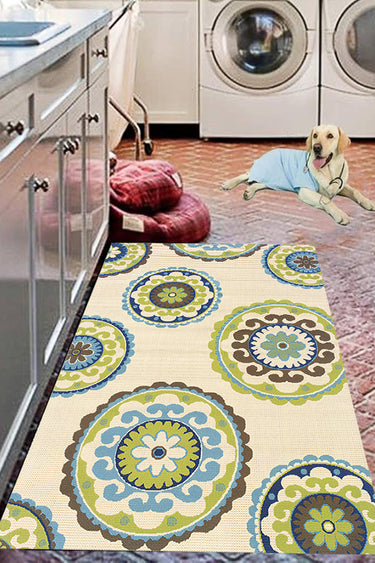 Bohemian, global style indoor-outdoor area rug, Features a medallion pattern, Power-loomed from 100% polypropylene with a woven polypropylene backing, This striking indoor/outdoor collection features popular shades of indigo, Mediterranean blue and bright lime green. Simple, sophisticated patterns are brought to life through vibrant color and texture making the Caspian collection a high-style selection perfectly suited for your favorite spot indoors or out. Rug backed by woven polypropylene, the use of a rug pad is recommended